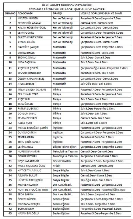 Sayın veliler öğretmenlerimizle görüşmek için e devletten randevu alırken aşağıdaki tabloya uygun olarak randevu alınız. Bu saatler dışında öğretmenlerimizin dersi olduğu için gelen veliler ile görüşemeyecektir.